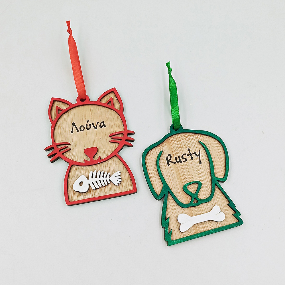 Χριστουγεννιάτικο στολίδι σε σχήμα σκύλου ή γάτας από ξύλο σε πράσινο ή κόκκινο και το όνομα από το ζωάκι σας