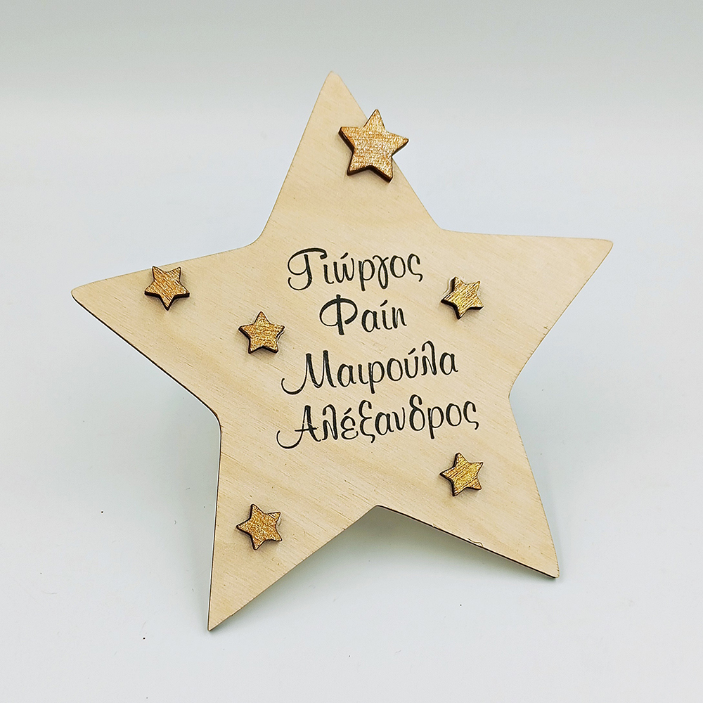 Αστέρι κορυφής από ξύλο με εκτύπωση τα ονότα που επιθυμείτε και διακοσμητικά ξύλινα αστεράκια με χρυσό γκλίτερ