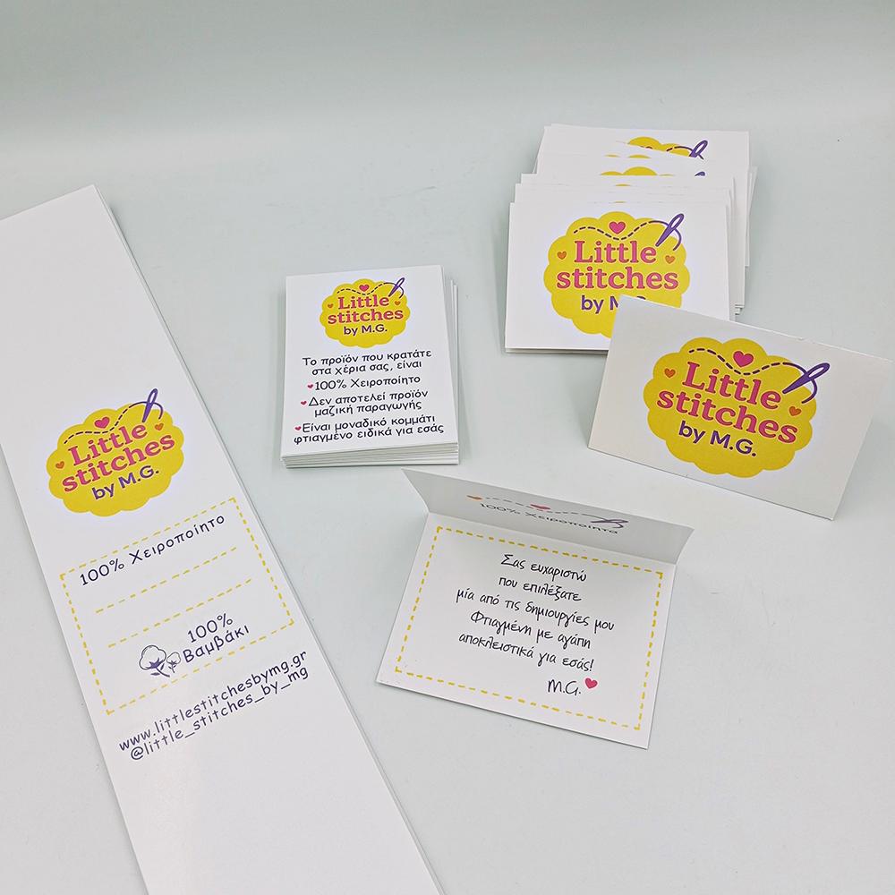 Ανοιγόμενη επαγγελματική κάρτα με ευχαριστήριο μήνυμα στο εσωτερικό, καρτούλες με πληροφορίες προϊόντος και ζώνες συσκευασίας για πετσέτες-κουβερτάκια